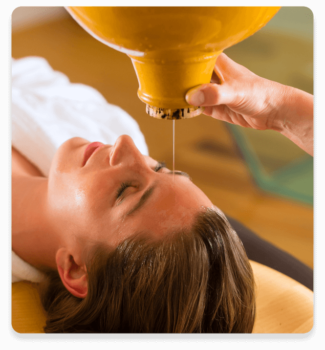 Ksheer Dhara uses milk infused with herbs. The medicated milk is poured over the head, and it is helpful in Vata and Pitta's predominant headaches, stress, and anxiety and helps nourish and relax the body.