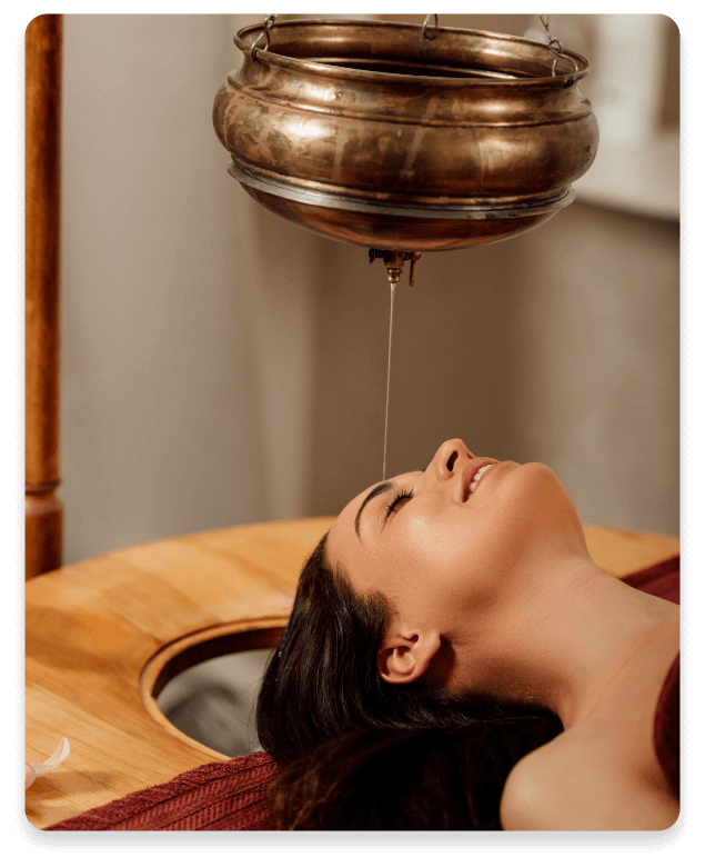 Ksheer Dhara uses milk infused with herbs. The medicated milk is poured over the head, and it is helpful in Vata and Pitta's predominant headaches, stress, and anxiety and helps nourish and relax the body.